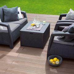 Corfu box - это элегантный мебельный гарнитур с фактурой, напоминающей ротанг, который состоит из двух кресел, двухместного дивана и столика-сундука. Продукт оснащён мягкими подушками сидений. В столе-сундуке всегда можно спрятать вещи от дождя. Мебель с легкой и одновременно устойчивой конструкцией красиво впишется в любое приусадебное пространство, такое как сад или терраса. Набор очень легко чистится. Изготовлен из стойкого к воздействию УФ-излучения пластмассы.